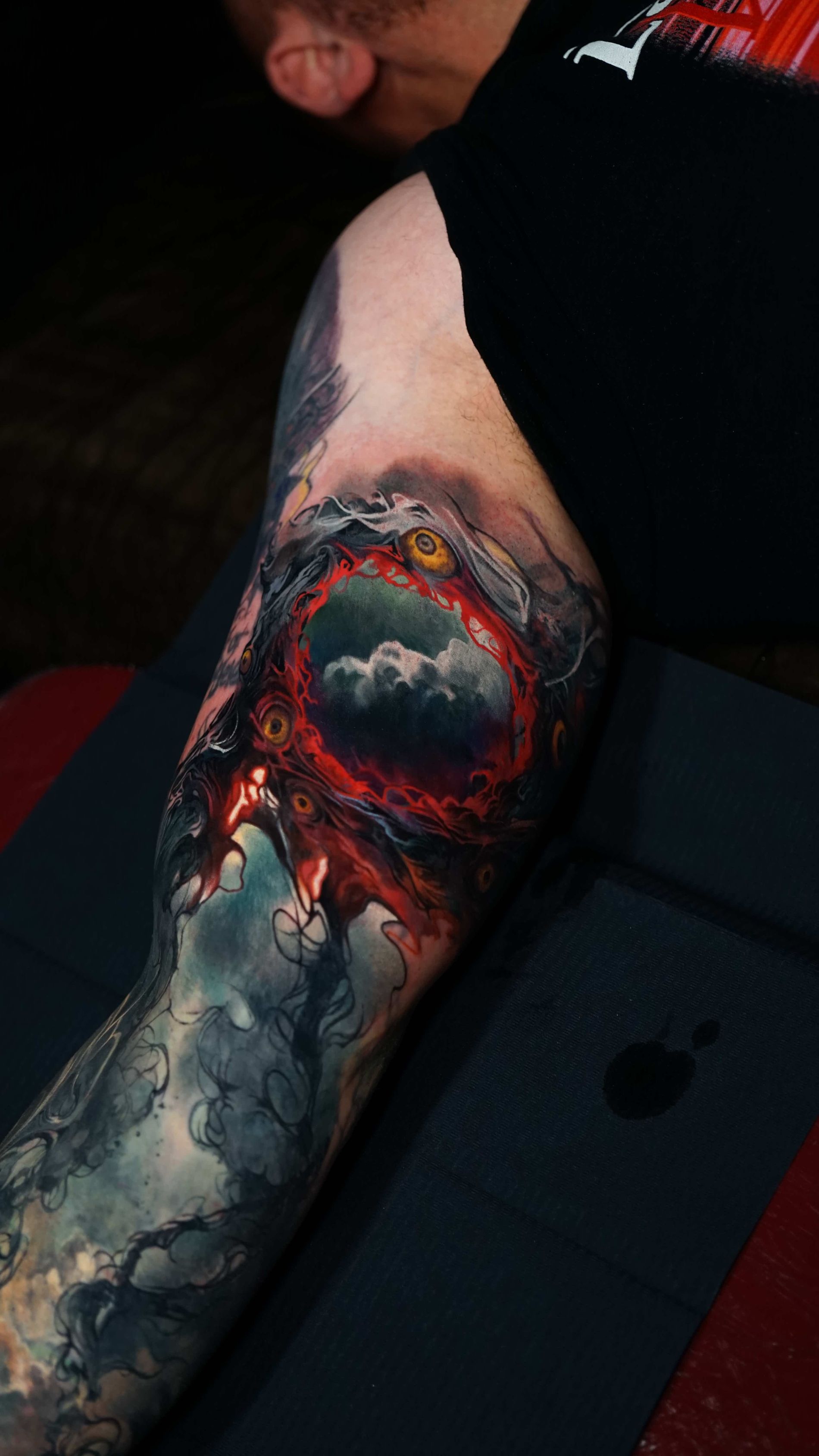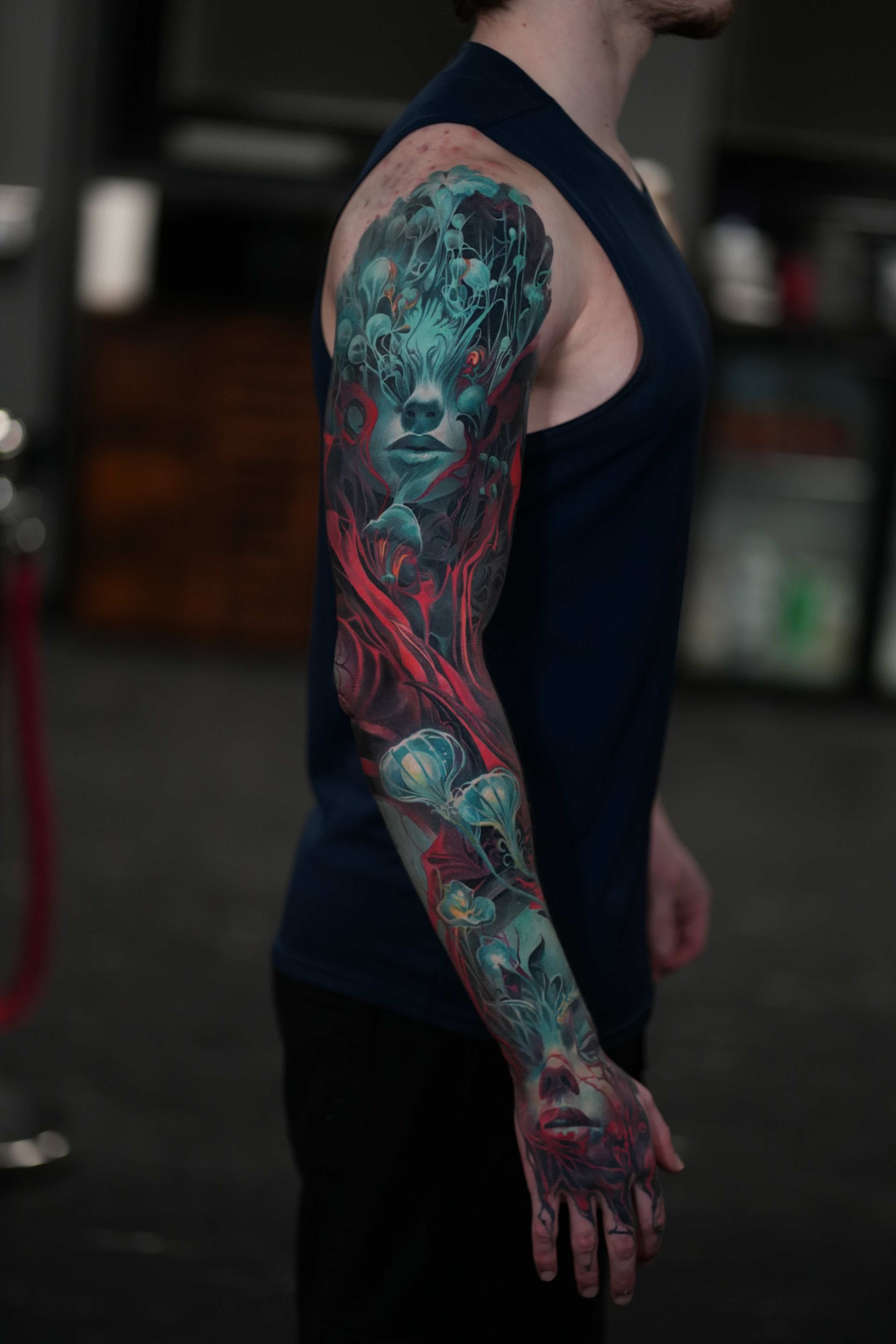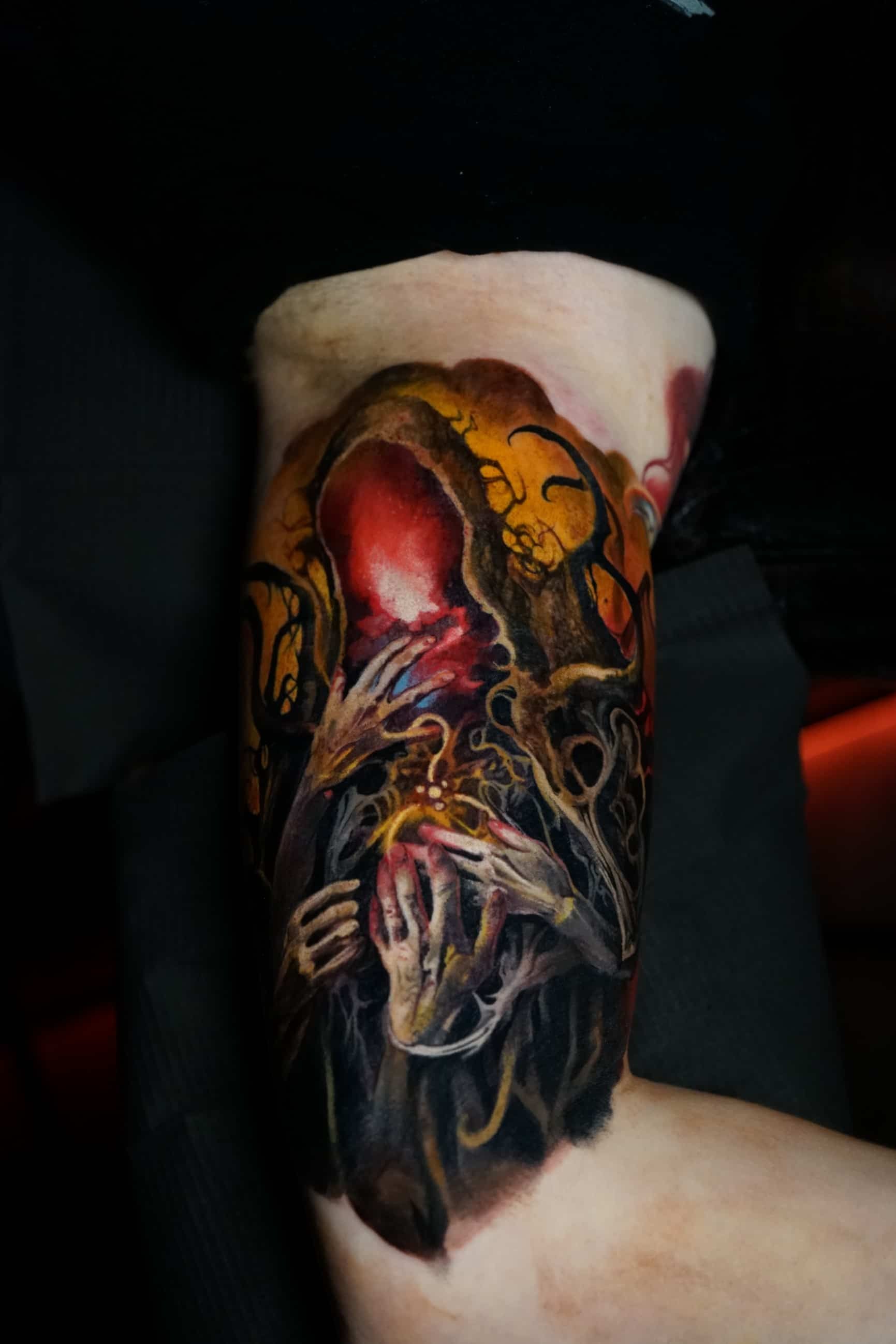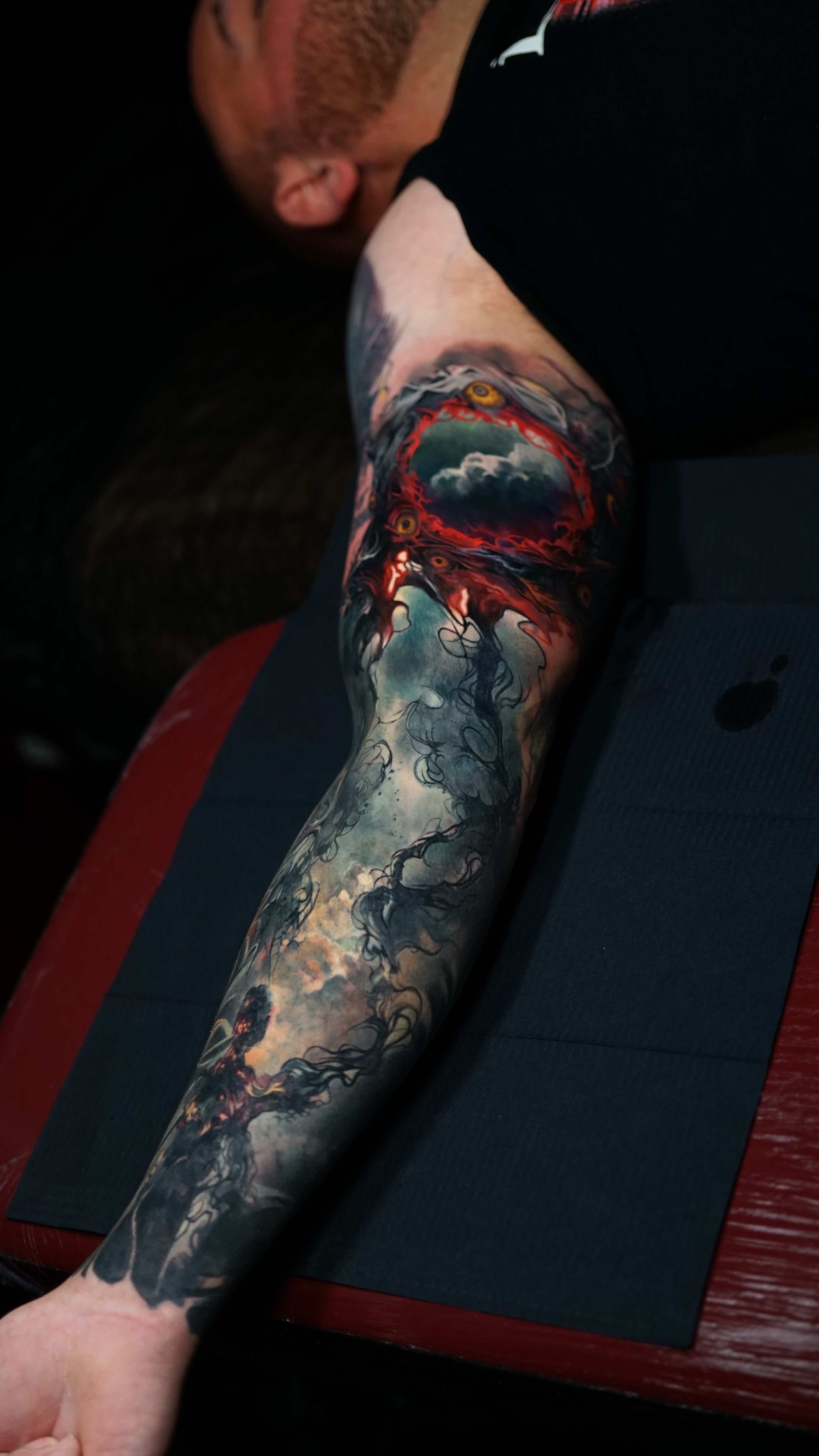 Hi, my name is Alexander Kuzmin and I am co-owner of Requiem Tattoo Shropshire. I have been tattooing for over 12 years and my speciality is my own style of surrealism. I like making art with a narrative and aim to inject a little lore into each one of my pieces. I am extremely selective of the pieces and clients I work with to ensure the best creative process and the most favourable outcome. I don't work with everyone but the people I do work with usually become lifelong friends. During your session I'm happy to chat and have a laugh or we can stay quiet and focus on our own tasks, either is fine with me as long as you're relaxed and comfortable.